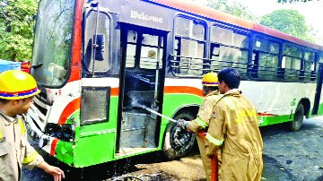 नोएडा (युग करवट)। शुक्रवार को परी चौक की ओर जा रही यूपी रोडवेज की एक खाली बस में अचानक आग लग गई। चालक ने सूझबूझ और तत्परता दिखाई। जिसके कारण बड़ा हादसा टल गया। चालक ने तुरंत बस रोकी और बाहर निकला। घटना की सूचना मिलते ही दमकल विभाग की टीम मौके पर पहुंची और आग बुझाने में जुट गई। करीब आधे घंटे में आग पर काबू पा लिया। गनीमत रही कि घटना में कोई जनहानि नहीं हुई। प्राथमिक जांच में आग लगने का कारण शॉर्ट सर्किट बताया गया है। गनीमत रही कि घटना के वक्त बस में कोई यात्री नहीं था। जिससे किसी प्रकार की जनहानि नहीं हुई।