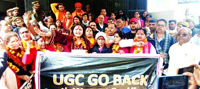गाजियाबाद (युग करवट)। आज जगदम्बा महाकाली डासना वाली की बेटियां महाकाली बनकर अपनी संतानों की रक्षा के लिए यूजीसी एक्ट 2026 के विरोध में रणक्षेत्र में उतर गई। इन सभी ने जगदम्बा महाकाली और महादेव के नाम पर इस काले कानून के विरुद्ध हर संघर्ष करने की शपथ ली। महाकाली मंदिर शिवशक्ति धाम डासना से जिला मुख्यालय तक पैदल मार्च किया और जिलाधिकारी के माध्यम से उच्च शिक्षा मंत्री धर्मेंद्र प्रधान को ज्ञापन भेजा।